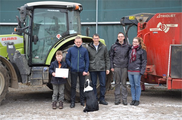 Bild v.l.n.r. anlässlich der Übergabe der Gewinnerurkunde: Niklaus Kuelling, Hans-Werner Kuelling, Markus Aebi (Leiter Marketing Serco Landtechnik), Dominic + Corinne Müller (CLAAS Partner Kanton Schaffhausen, Müller Siblingen GmbH).