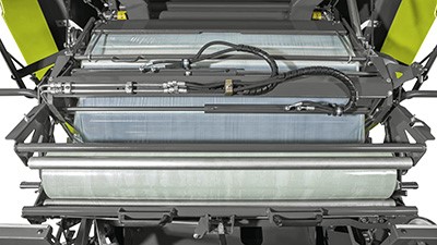 CLAAS bietet für die Rundballenpressen der ROLLANT 400 UNIWRAP Familie ein neu entwickeltes System für die Bindung der Ballen in der Presskammer an. Statt der üblichen Netzbindung können die Rundballen nun erstmals auch mit Mantelfolie gebunden werden. Die Netzbindung ist nach wie vor möglich, genauso wie der schnelle Wechsel zwischen Netz und Mantelfolie ohne Umbaumaßnahmen. Zudem ist die neue Rundballenpresse serienmäßig mit einer Rollenrampe ausgerüstet, die das Nachlegen neuer Rollen wesentlich erleichtert.